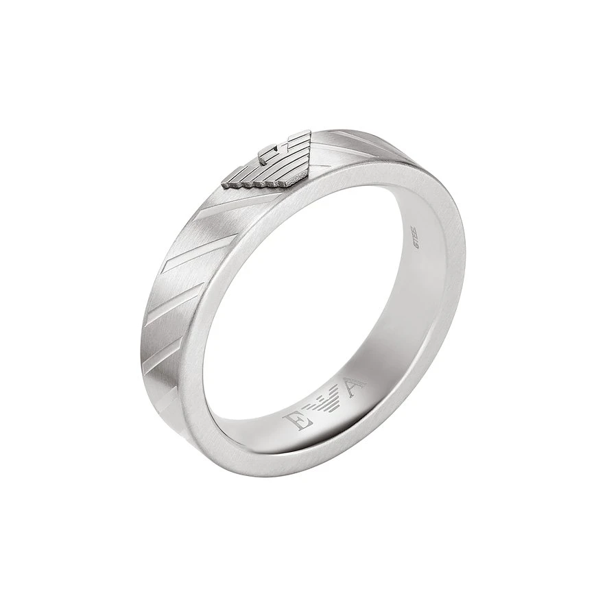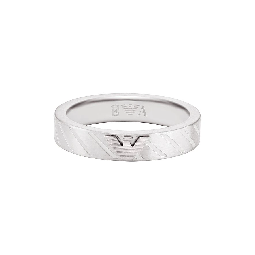 Markantes Design und Understatement passen sehr gut zusammen, wie Emporio Armani mit diesem Herrenring beweist. Der attraktive Edelstahlring hat eine mattierte, silberne Oberfläche, über die schräge Streifen verlaufen. In der Mitte sitzt der stilisierte Adler der Luxusmarke und bildet einen schmuckvollen Aufsatz. Zu der massiven Optik gesellt sich also auch eine glamouröse Aura. Genau so funktioniert Eleganz auf die lässige Art.