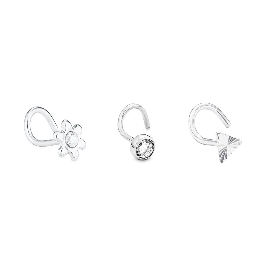 Winzige Preziosen mit großer Außenwirkung sind diese charmanten Nasenstecker von FAVS. Das Schmuckset besteht aus 3 verschiedenen Modellen, die je nach Anlass, Lust oder Laune variiert werden können. Hochwertiges 925er Silber sorgt für Langlebigkeit und garantiert viele Jahre Freude an diesen schmucken Accessoires. Die Deko-Elemente zeigen einmal eine abstrakte Blüte, einen schlichten, runden Schmuck-Kristall und ein dynamisches Dreieck für den besonderen Aha-Effekt.