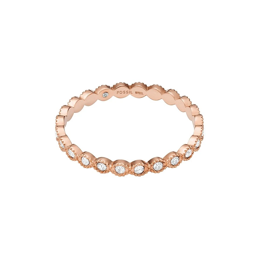 Der feine Ring fügt sich aus kleinen, runden Elementen zusammen, in denen es aufblitzt: Weiße Farbsteine bringen das feminine Schmuckstück im charmanten Roségold zum Funkeln. Wie eine Saumkante führt eine gepunktete Linie auf beiden Seiten des vergoldeten Edelstahlrings entlang. Mit dieser Linie betont Fossil die gewellte Form und den dezenten Glanz, der wiederum die elegante Aura unterstreicht.