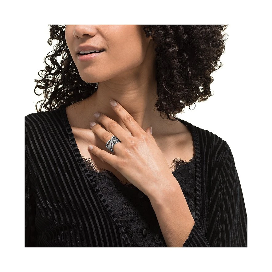 Magisch ineinandergeschlungen werden bei diesem Ring von JETTE Silver zwei Segmente zusammen geführt. Punktuell eingesetzte Verläufe von *Zirkonia in Pavé-Fassung komplettieren die grafische Gestaltung des Schmuckstücks. Kleine Zwischenräume innerhalb der Ringschienen erzeugen im Zusammenspiel mit Ihrer Haut ein besonders verführerisches Bild. 925er Silber ist bei dieser Kreation die perfekte Wahl, denn es verleiht der Dynamik einen Hauch Lässigkeit und Modernität.