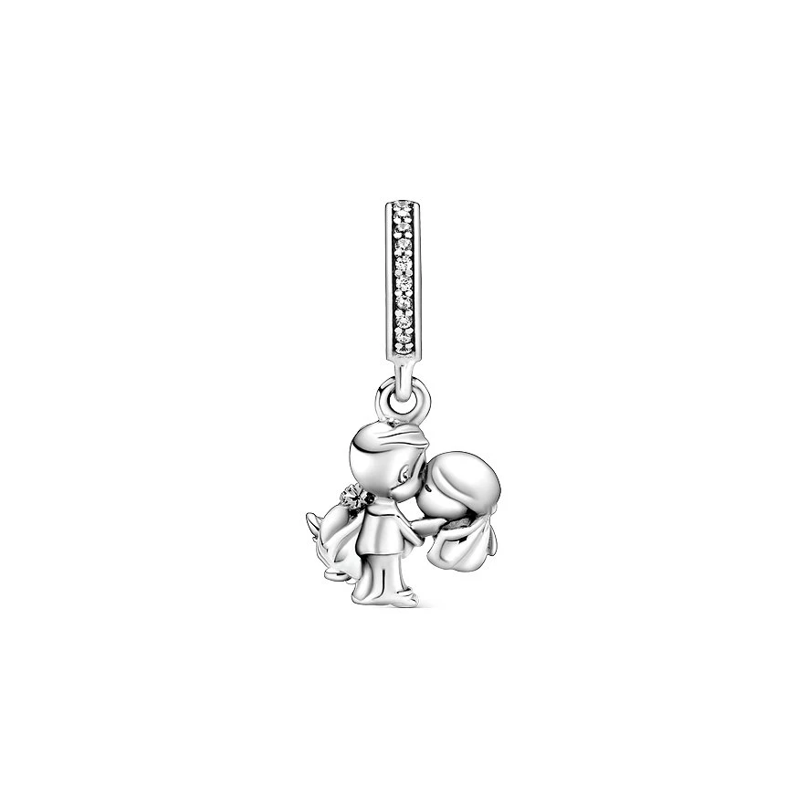 Die Hochzeit ist ein besonderer Tag im Leben. In diesem Charm-Anhänger aus Sterling-Silber ist dieser Moment verewigt. Es zeigt ein frisch vermähltes Brautpaar beim Küssen. Während er sie sanft umfasst, hält sie einen fein ausgearbeiteten Blumenstrauß in den Händen. Für einen Hauch Glamour sorgt der mit Cubic Zirkonia* besetzte Aufhänger. Das Charm ist mit allen Armbändern von Pandora Moments kompatibel.